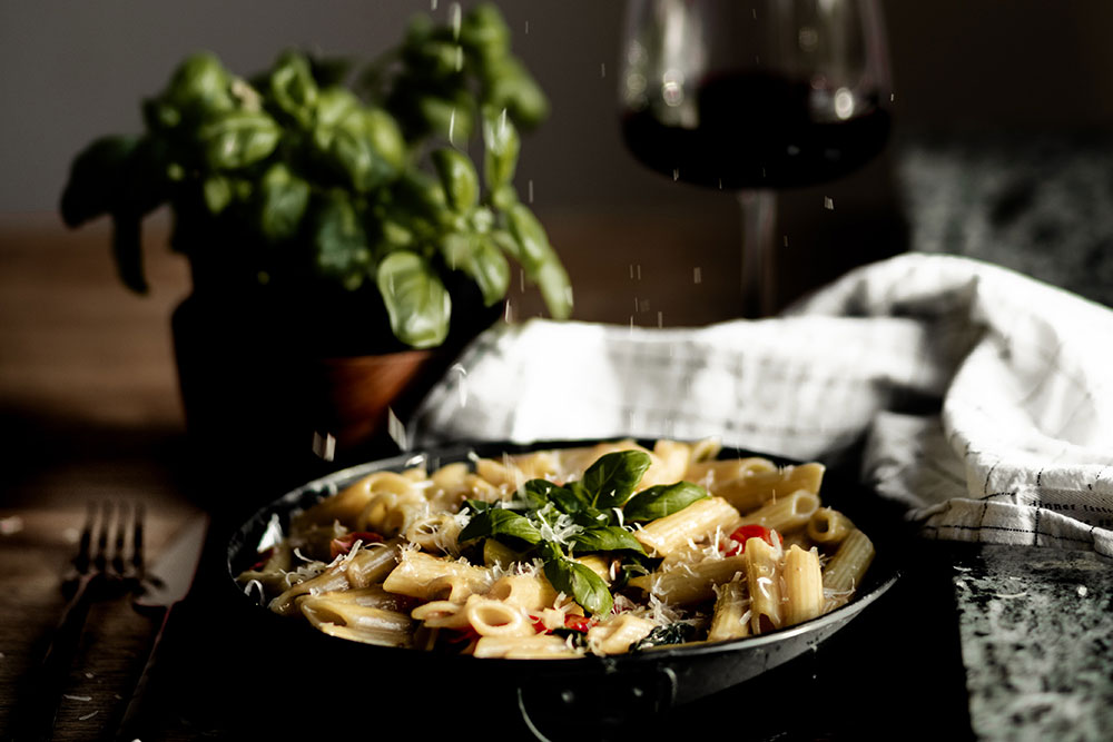 Tavuk, bonfile california biberi, az sarımsak, soğan, cheddar peyniri, maydonoz ve ekşi krema ile