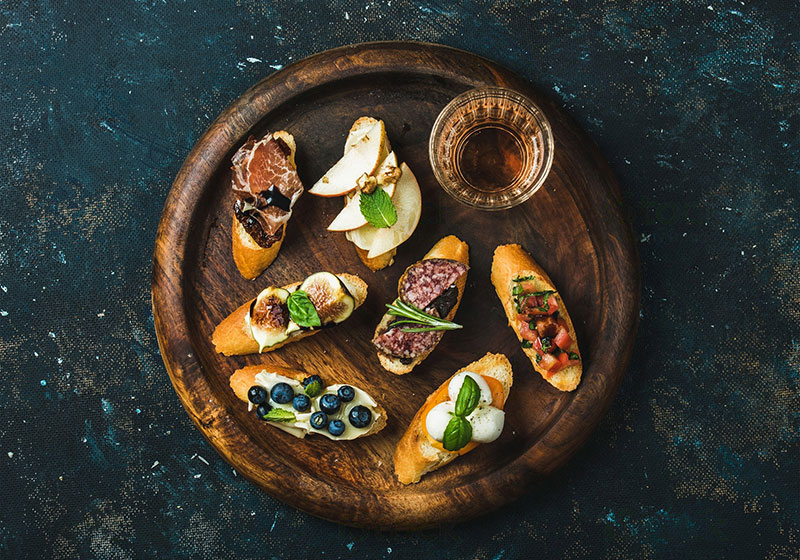 (Füme Antrikot, kızarmış ekmek çırpılmış labne, frenk soğanı, roka, kavruk badem ve cips ile.)